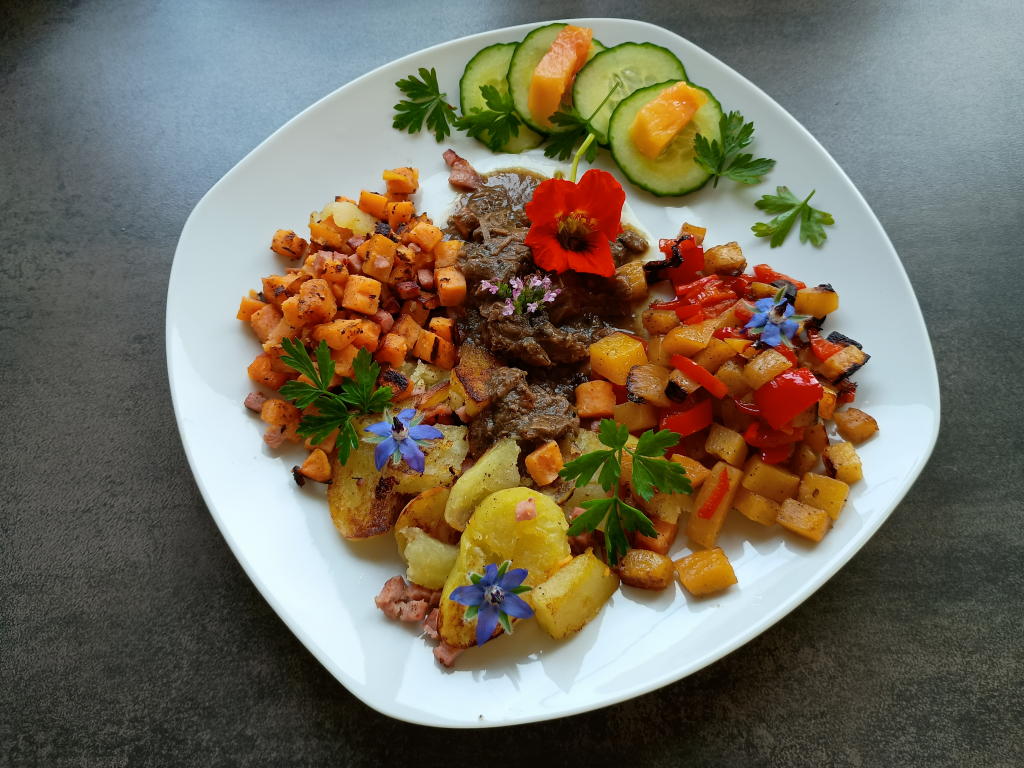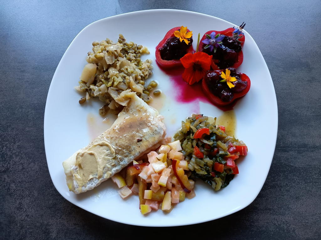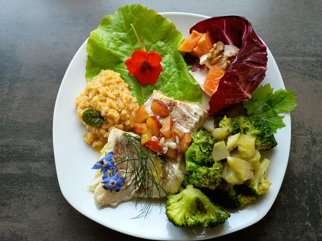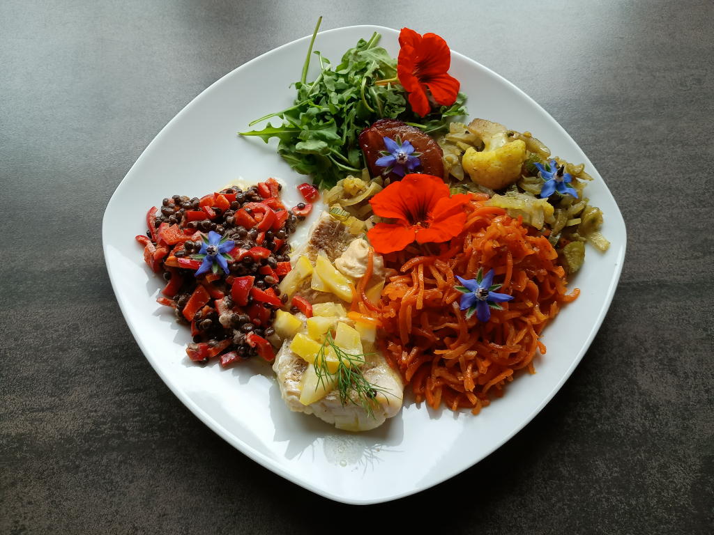Mittagsspeisen im November 2025 Im November konnten noch viele Blüten aus dem Garten eingesetzt werden.